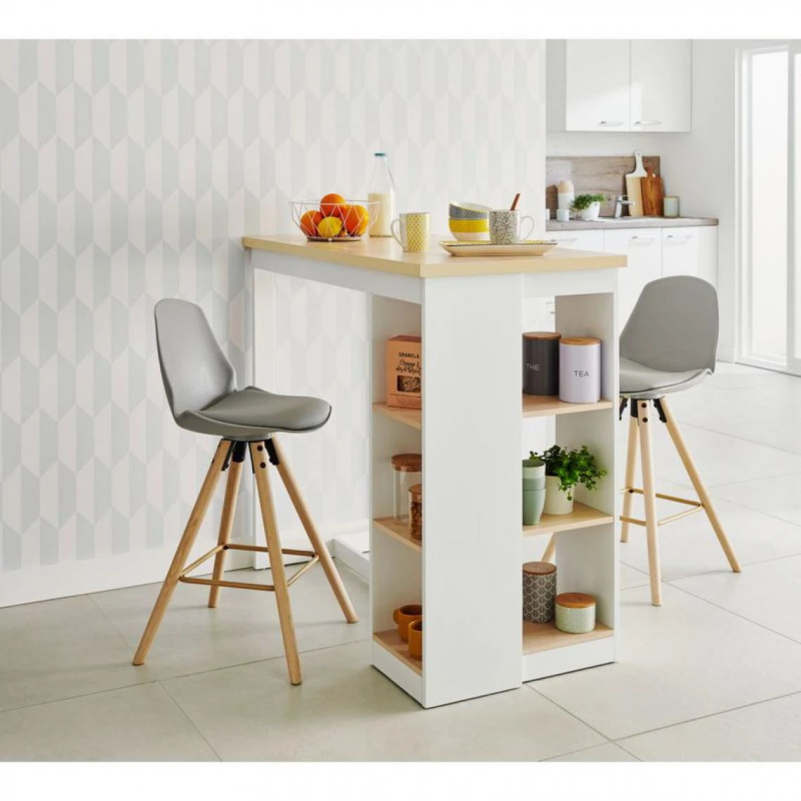 Avec son coloris pastel et ses pieds en bois clair, ce tabouret de bar gris est typique du design scandinave. Il est idéal pour donner une petite touche nordique à un espace. Associez votre tabouret à un mange-debout blanc et en bois clair pour maximiser l’effet décoratif et créer un petit coin cosy et chaleureux.