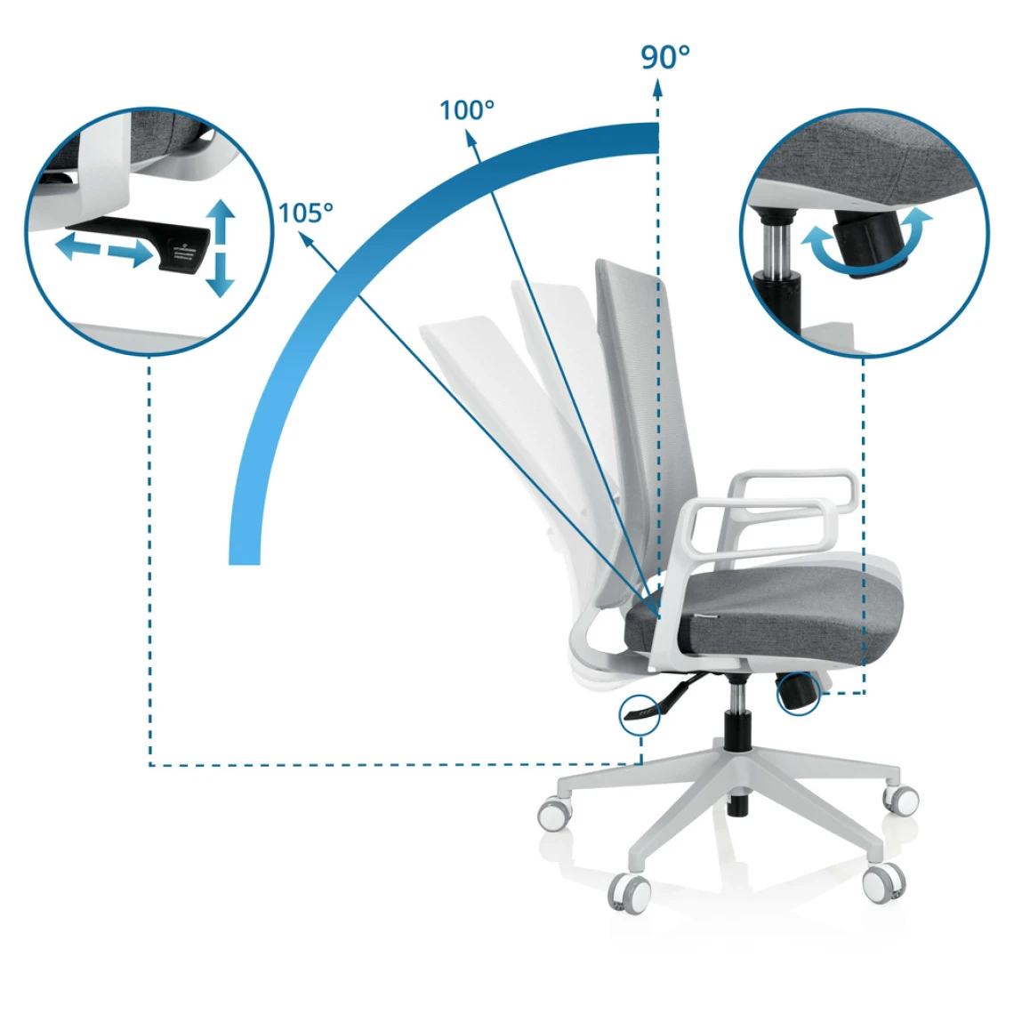 - Mécanisme synchrone, blocable en 3 niveaux, ajustable individuellement au poids de l’utilisateur