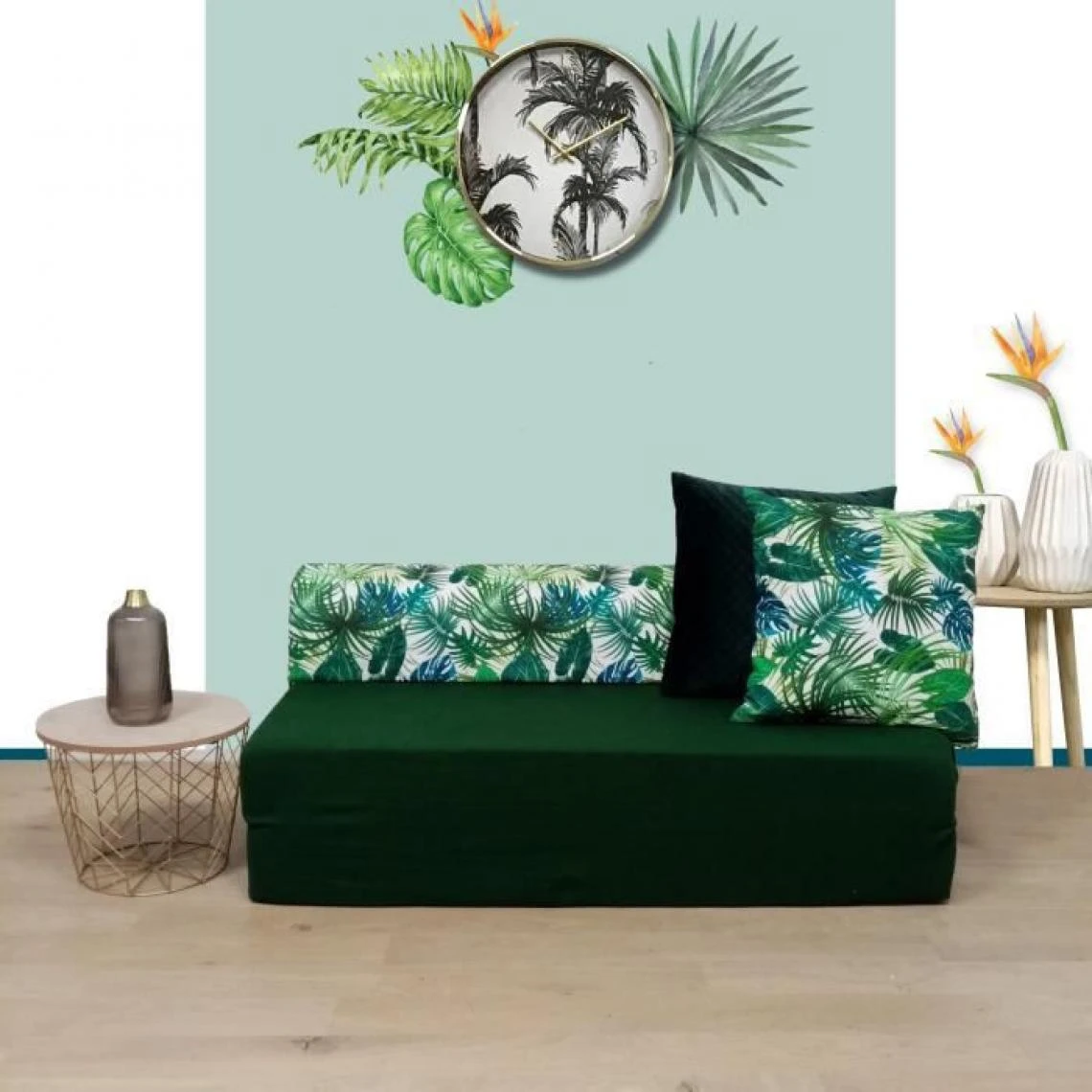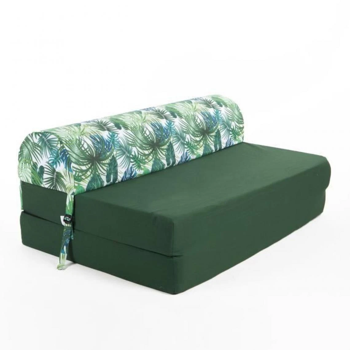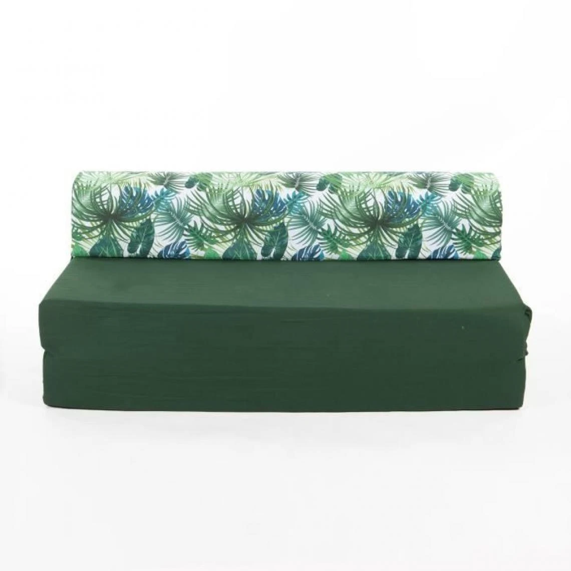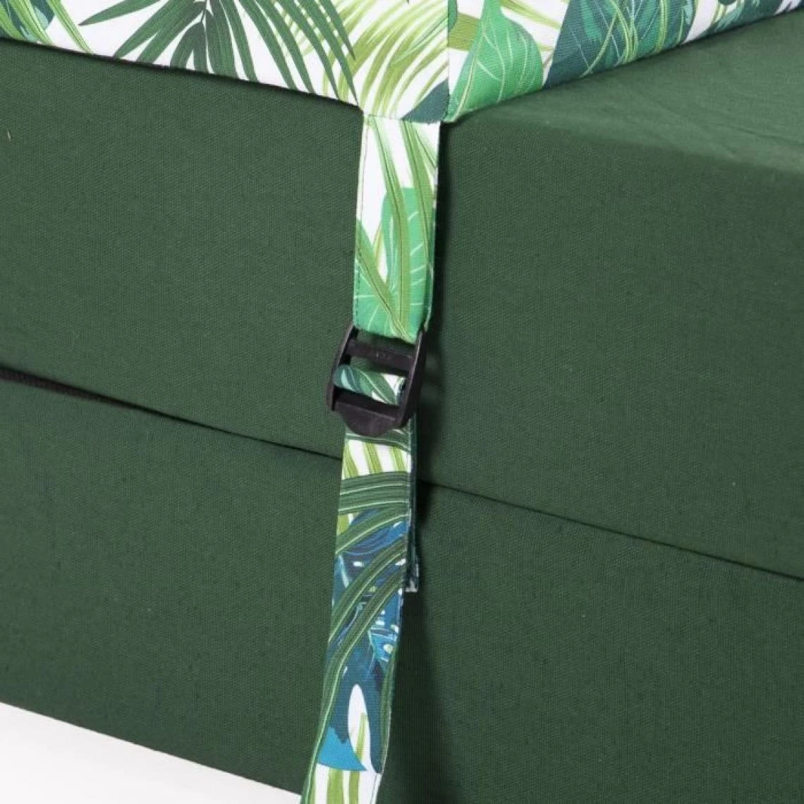 BANQUETTE 2 PLACES BASE UNIE ET TÒTIERE IMPRIME DEEP JUNGLE – TOILE COTON – BOUCLES PLASTIQUES – GARNISSAGE MOUSSE POLYETHER 17kgs/m3 – NON DEHOUSSABLE – DIMENSIONS : L115x75cm