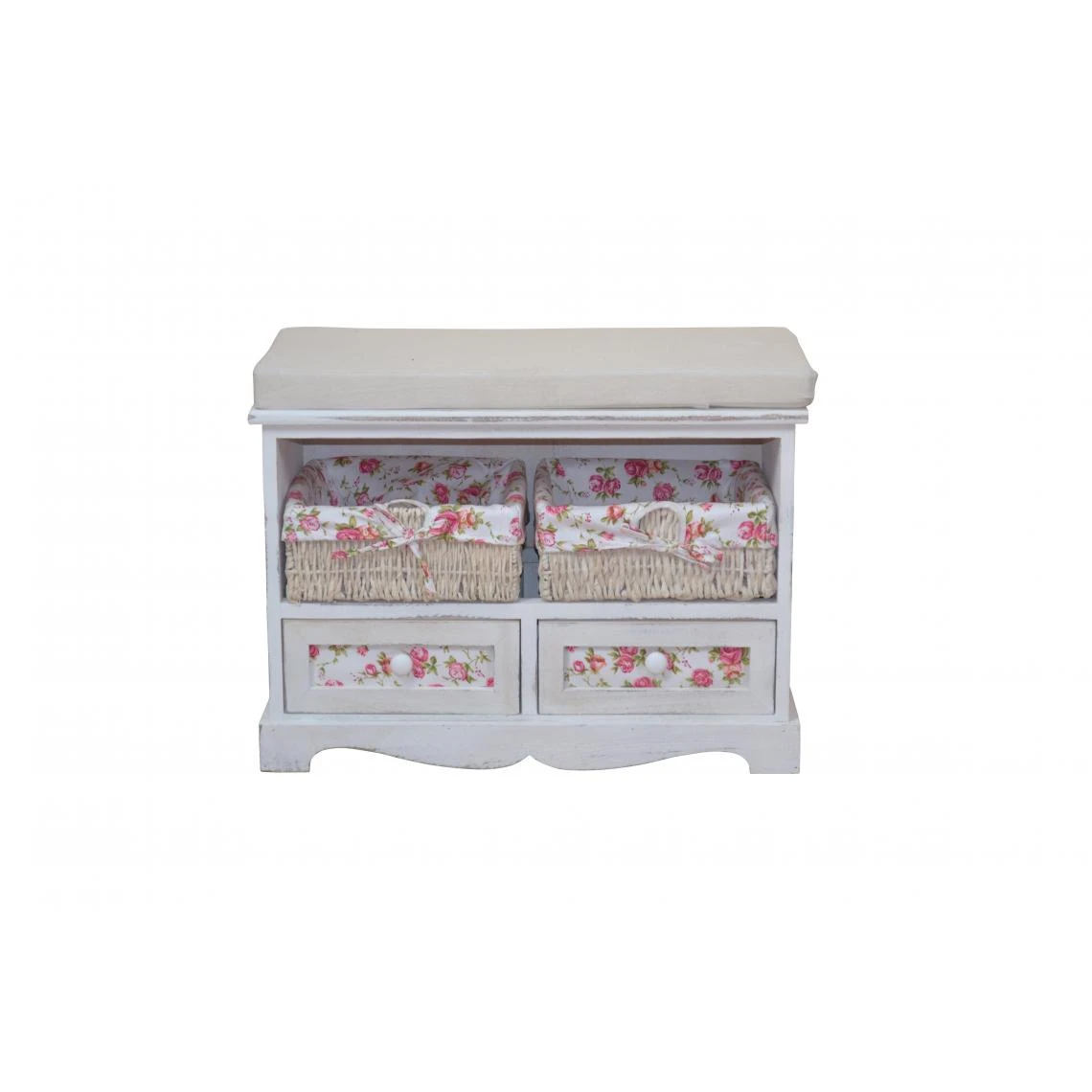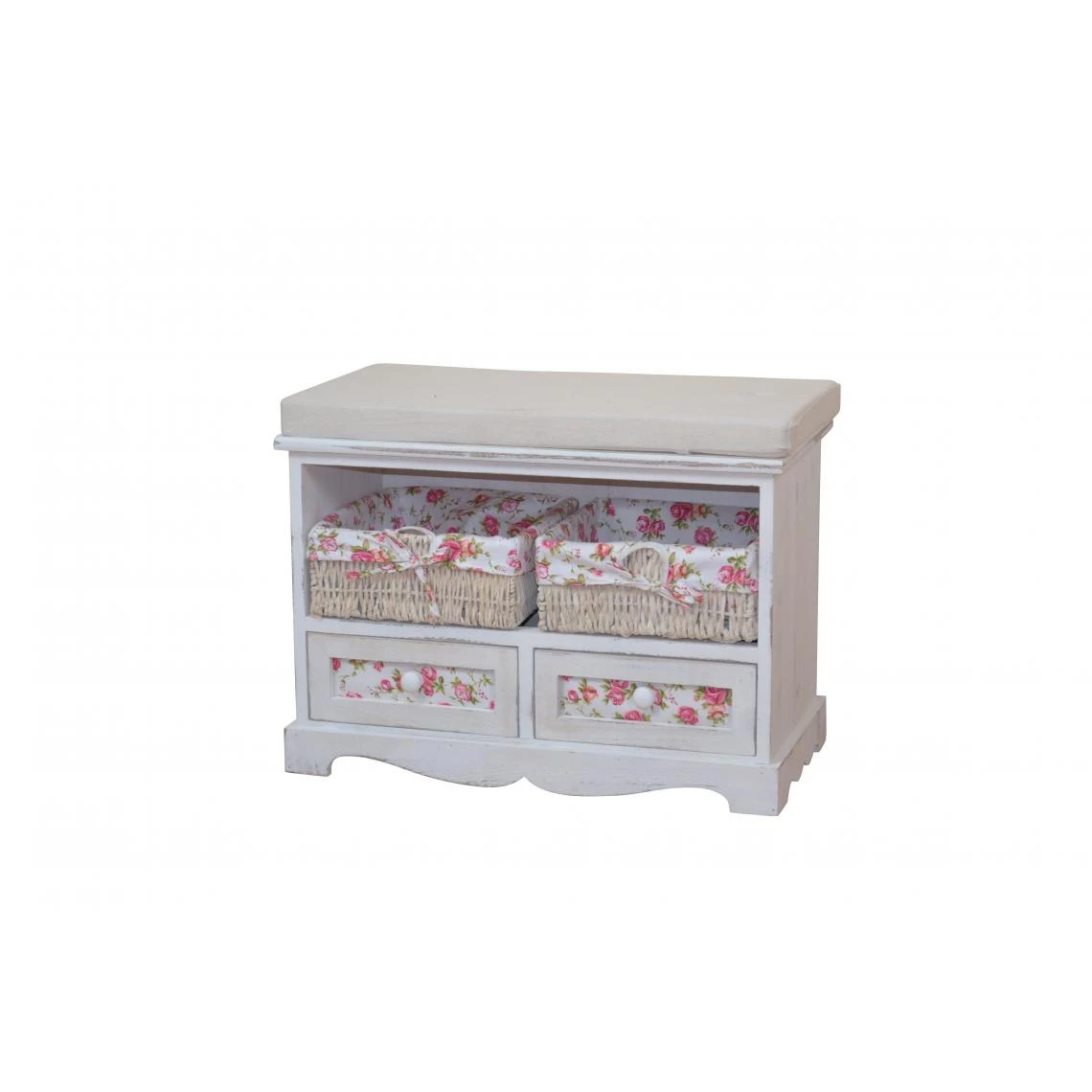 Banc / banquette avec 2 tiroirs et 2 paniers de rangement et coussin Matériau: Banquette : Bois de Paulownia blanc vieilli style vintage Panier: tresse de maïs avec un tissu rose fleuri amovible Coussin en tissu crème: 80% coton / 20% polyester Dimensions commode: 61x33x47 cm (longueur x profondeur x hauteur) Dimensions intérieures du tiroir: 24x24x24 cm. Dimensio paniers: 25x24x9,5 cm Poids: 7 kg Nous ne faisons pas d’expédition sur les îles (Corse inclue), Monaco et les DOM/TOM Décoshop26 BAN05018