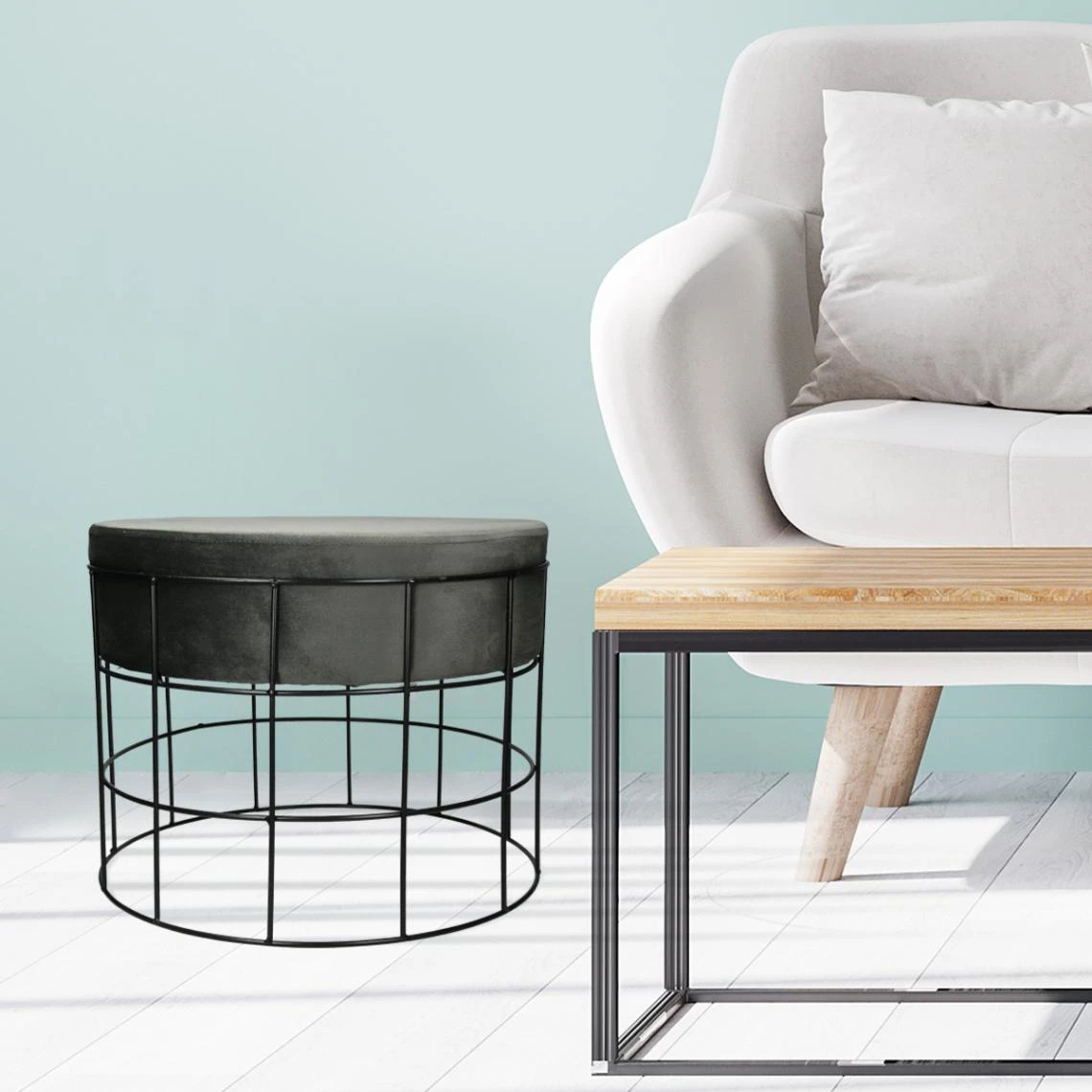 Points forts Ecd Germany Tabouret pouf ottomane repose-pieds rond en velour gris foncé et métal siège