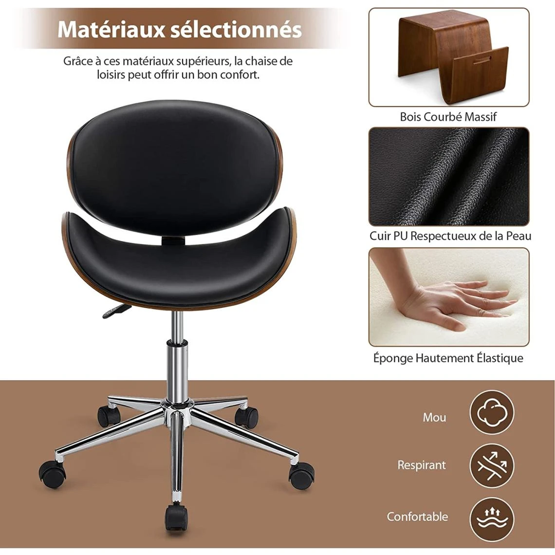 - Fabriquée en bois courbé de qualité supérieure, notrechaise de bureau est robuste et durable. De plus, elle est recouverte d’uneéponge et enveloppé de cuir plastifié PU, ce qui offre un confort extrême.Conçue pour les personnes de différentes tailles, le tabouret de bureau estréglable en hauteur (76-88 cm). Avec un siège pivotant à 360° et 5 roulettesuniverselles, vous pouvez se déplacer librement.