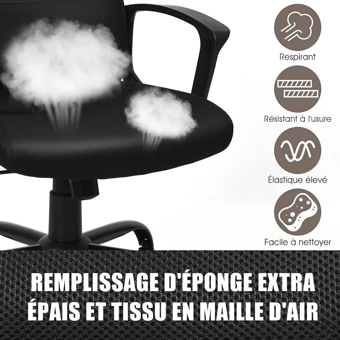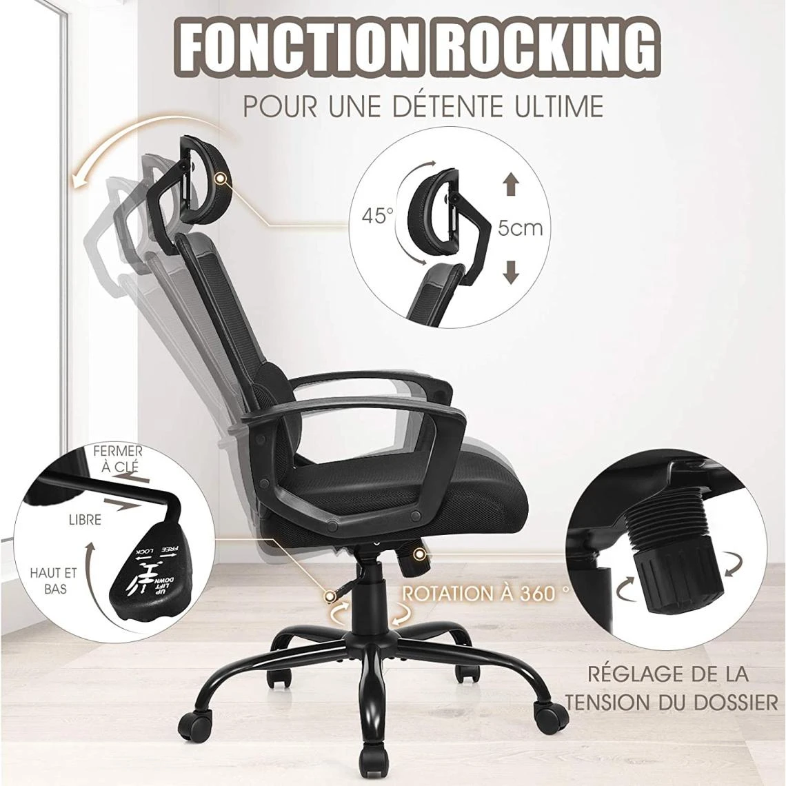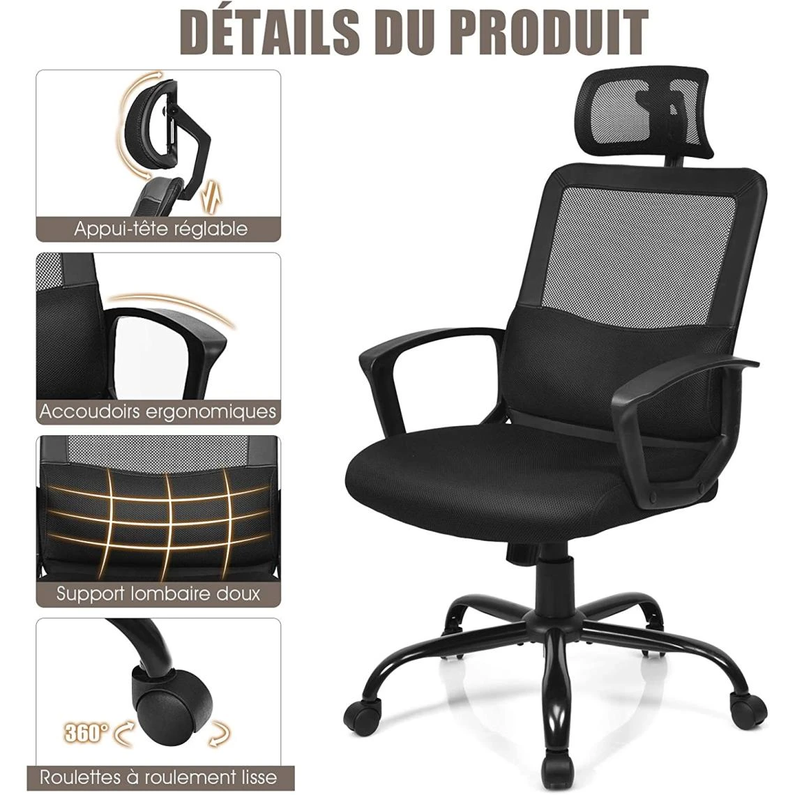 Points forts GIANTEX COSTWAY chaise de bureau ergonomique hauteur réglable fauteuil d’ordinateur en maille avec appui-tête pivotant renfort lombaire noir