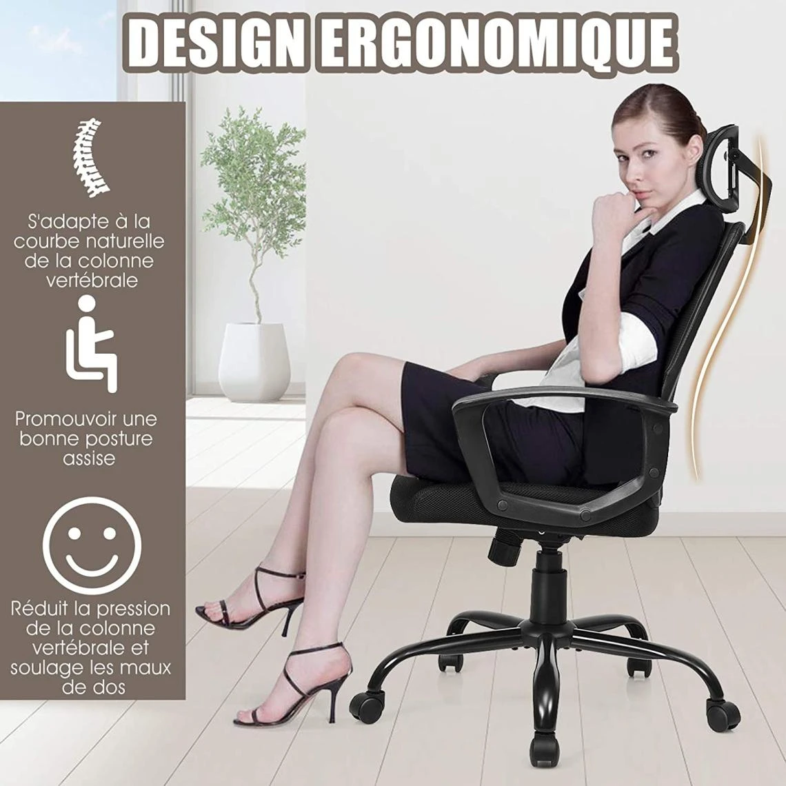 【Un confort optimal grâce à une conception ergonomique】doté d’un dossier en maille respirante et d’un siège en mousse rembourré avec renfort lombaire intégré, ce fauteuil permet de réduire efficacement la pression sur la colonne vertébrale, causée par un travail de longue durée. De plus, l’appui-tête réglable en hauteur et en inclinaison offre un appui plus confortable pour la tête et la nuque.