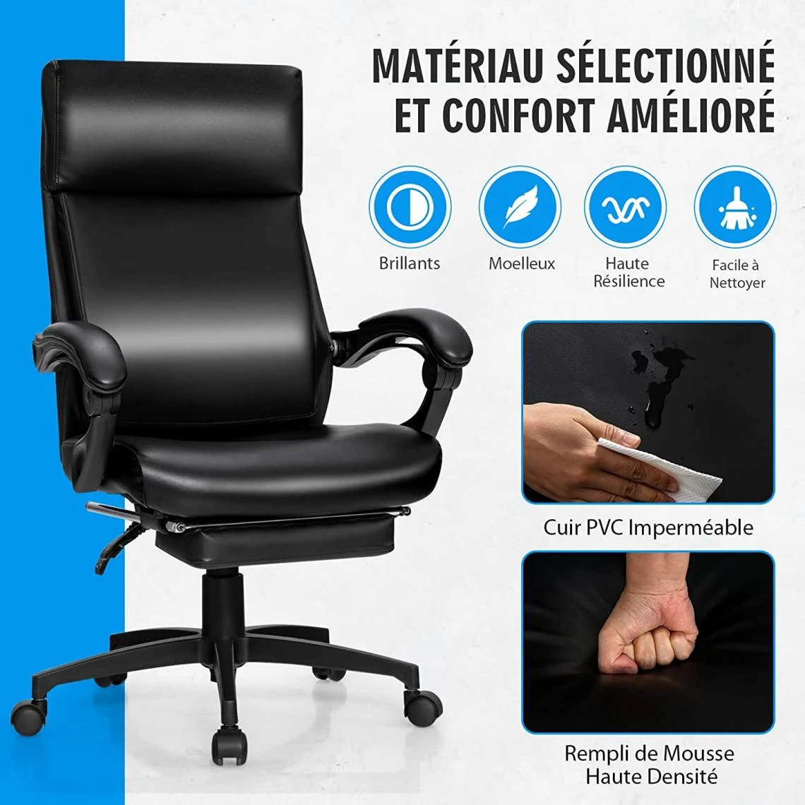 - Vous sentez-vous mal à l’aise parceque vous restez assis pendant de longues heures au bureau ? Notre fauteuil dedirection à dossier haut est fabriqué en cuir PVC de haute qualité et rempli demousse, avec un siège résistant pour vous offrir une expérience plusconfortable. De plus, deux accoudoirs ergonomiques et un repose-piedsescamotable vous permettront de rester assis plus confortablement. De plus, ledossier du siège est conçu pour épouser parfaitement les courbes du corps, etl’appui-tête supplémentaire offre le bon soutien pour votre tête et votre dos.En outre, notre chaise de bureau peut être ajustée avec une plage d’inclinaisonde 40 degrés et une plage de réglage en hauteur de 10 cm pour répondre demanière flexible à vos différents besoins. De plus, la base stable est dotéed’un vérin à gaz de classe 3 pour plus de sécurité et peut vous fournir jusqu’à150 kg de soutien, tandis que les cinq roulettes de la base vous permettent dedéplacer sans effort notre chaise ergonomique dans la pièce.