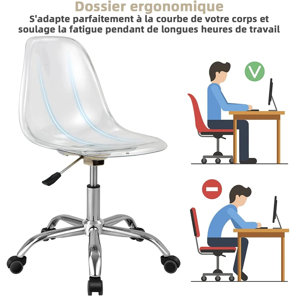 - 【Matériau de haute qualité construit pour durer:】La chaise de bureau est fabriquée en acrylique de haute qualité qui présente une bonne ténacité et une résistance à l’abrasion, et qui est durable pour une utilisation à long terme. De plus, la surface lisse est facile à nettoyer et à entretenir, vous n’avez donc pas à vous soucier de la poussière ou des taches.