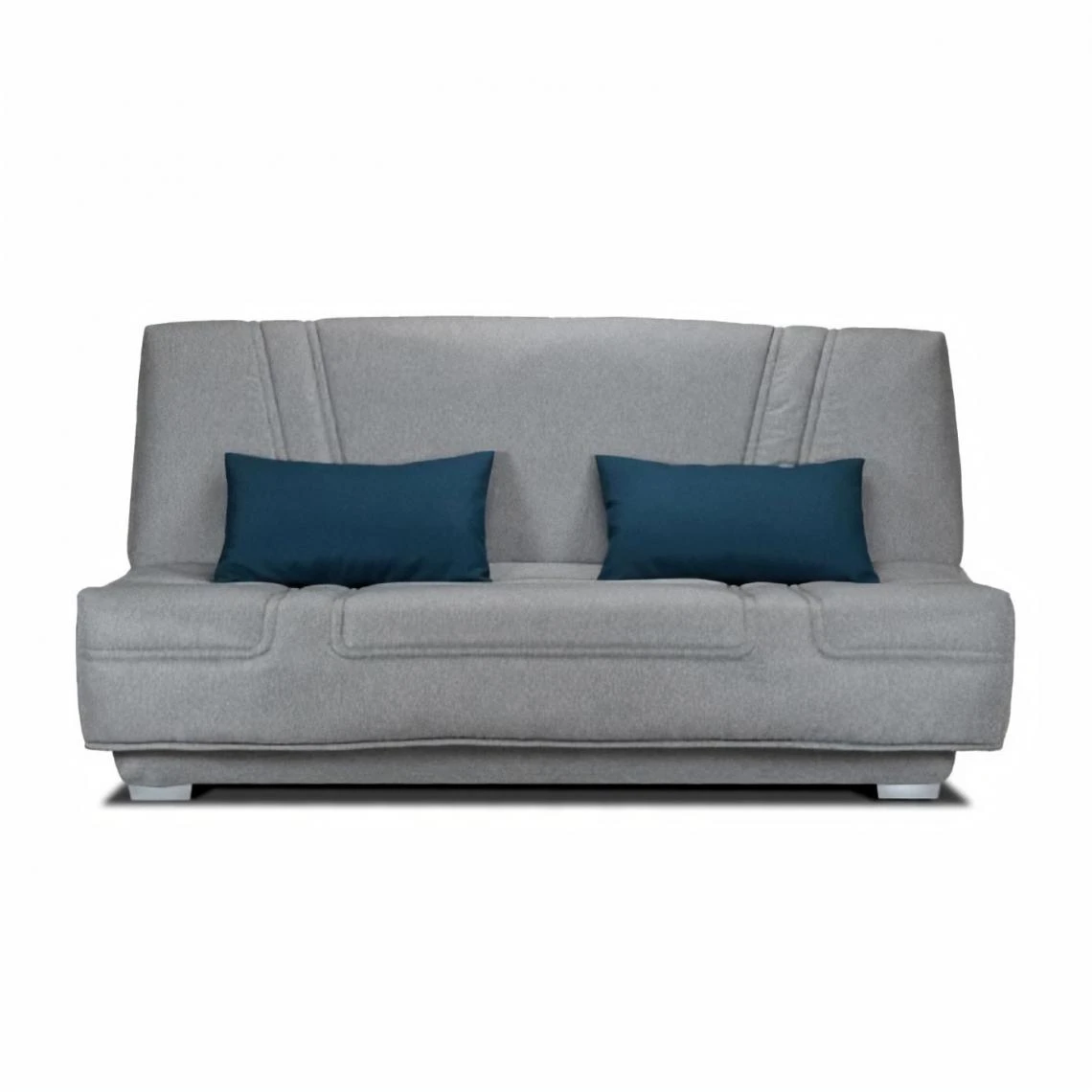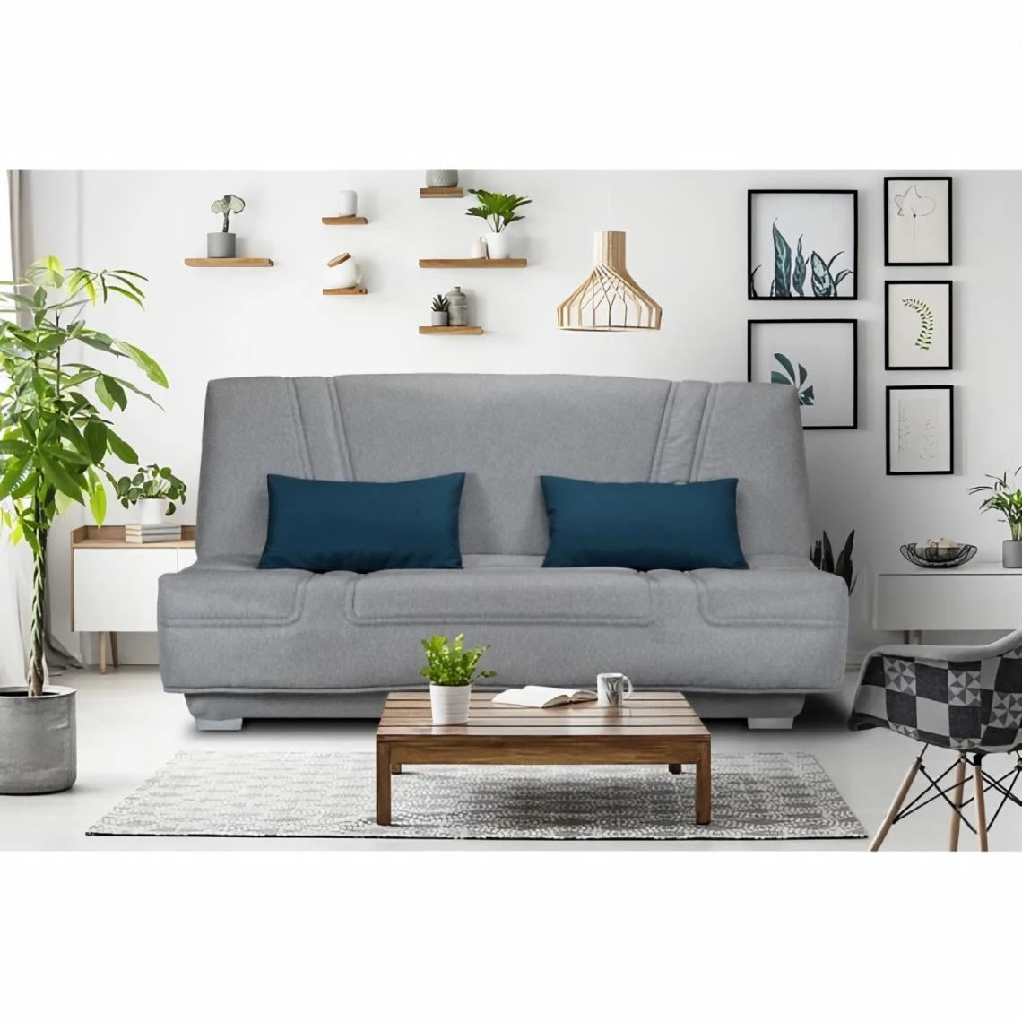GRUHIER Banquette clic clac BULTEX – Tissu Gris + Coussins déco bleu – L193 x P95 x H101cm – BELYNDA