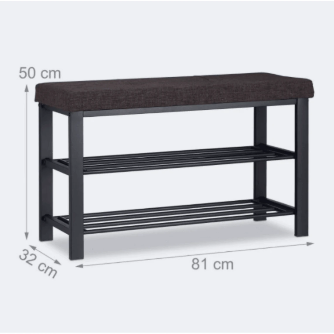 Étagère à chaussures avec rembourrage confortable Idéal pour l’entrée, la chambre ou le salon Design élégant qui s’adapte à tous les intérieurs 2 niveaux pour les chaussures de ville et les chaussons Coussin moelleux avec housse en tissu Aucunes rayures grâce aux patins de protection Contenu 1 x banc à chaussures Matériel de montage Banc à chaussures rembourré en un clin d’œil Dimensions totales H x L x P : env. 50 x 81 x 32 cm Surface support L x P : env. 77 x 26 cm En métal laqué, MDF, tissu Pèse environ 6,6 kg une fois monté