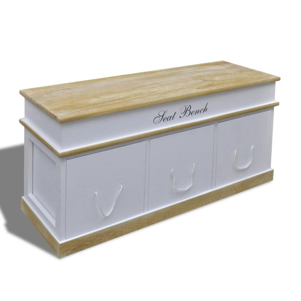 Ce banc de rangement fait de bois solide de haute qualitĂ©, est d’un design simple et Ă©lĂ©gant. Il peut non seulement accueillir vos objets, mais aussi amĂ©liorer la dĂ©coration de votre maison. Avec 3 tiroirs, ce banc de rangement vous apportera un large espace pour rangement, vous pouvez y ranger vos chaussures! Chaque tiroir peut contenir 3 ou 4 paires de chaussures. Il convient Ă©galement aux autres objets, comme vos pantalons ou vos chandails. Ce banc de rangement (2 ou 3 places) Ă©lĂ©gant et fonctionnel, vous permet de vous asseoir pour chausser avant de sortir. Ce banc de rangement trouve sa place dans l’entrĂ©e, le vestiaire ou la chambre etc. Vous pouvez trouver un bon Ă©quilibre entre le rĂ´le utilitaire et la fonction dĂ©corative de ce banc. Couleur: Blanc MatĂ©riau: Bois solide DImensions: 100 x 35 x 45 cm (L x l x H) Taille de tiroir: 30,5 x 30,5 x 25 cm (L x l x H) 3 larges tiroirs Helloshop26 3002017