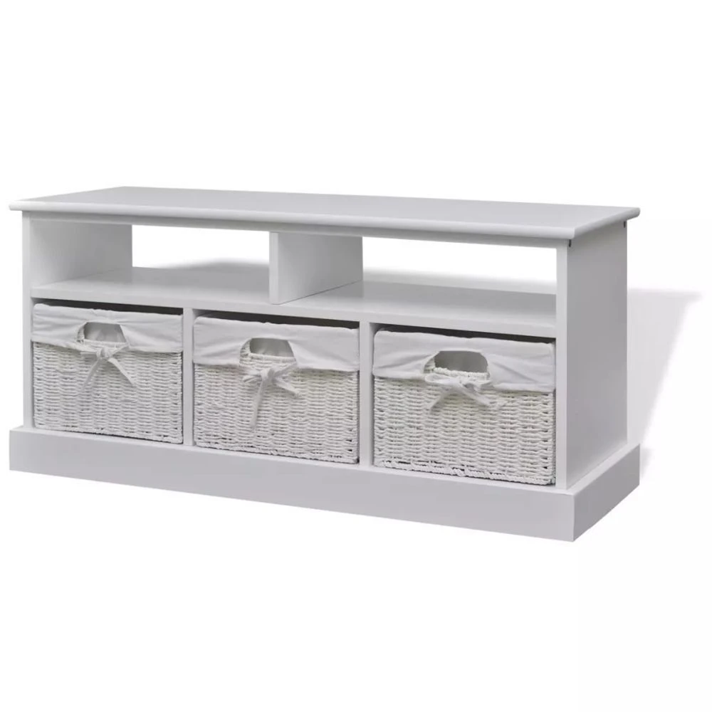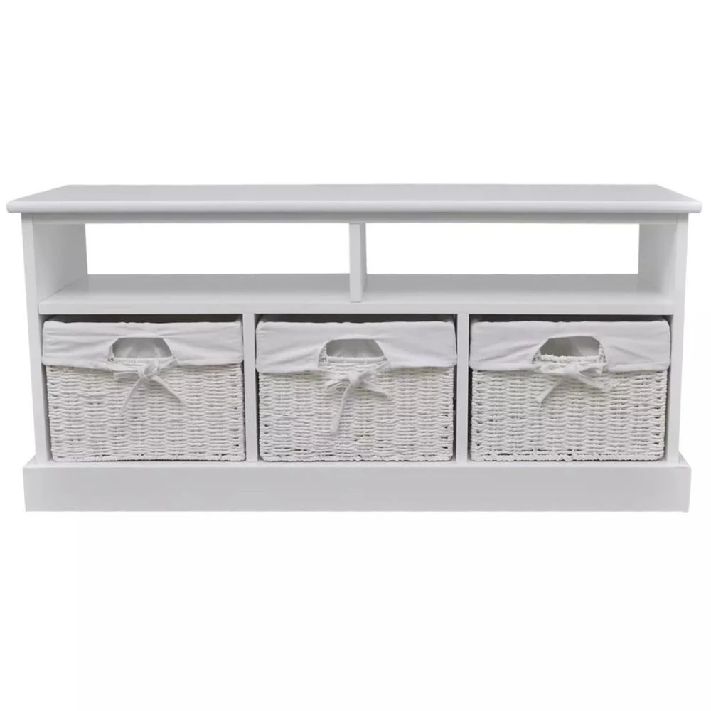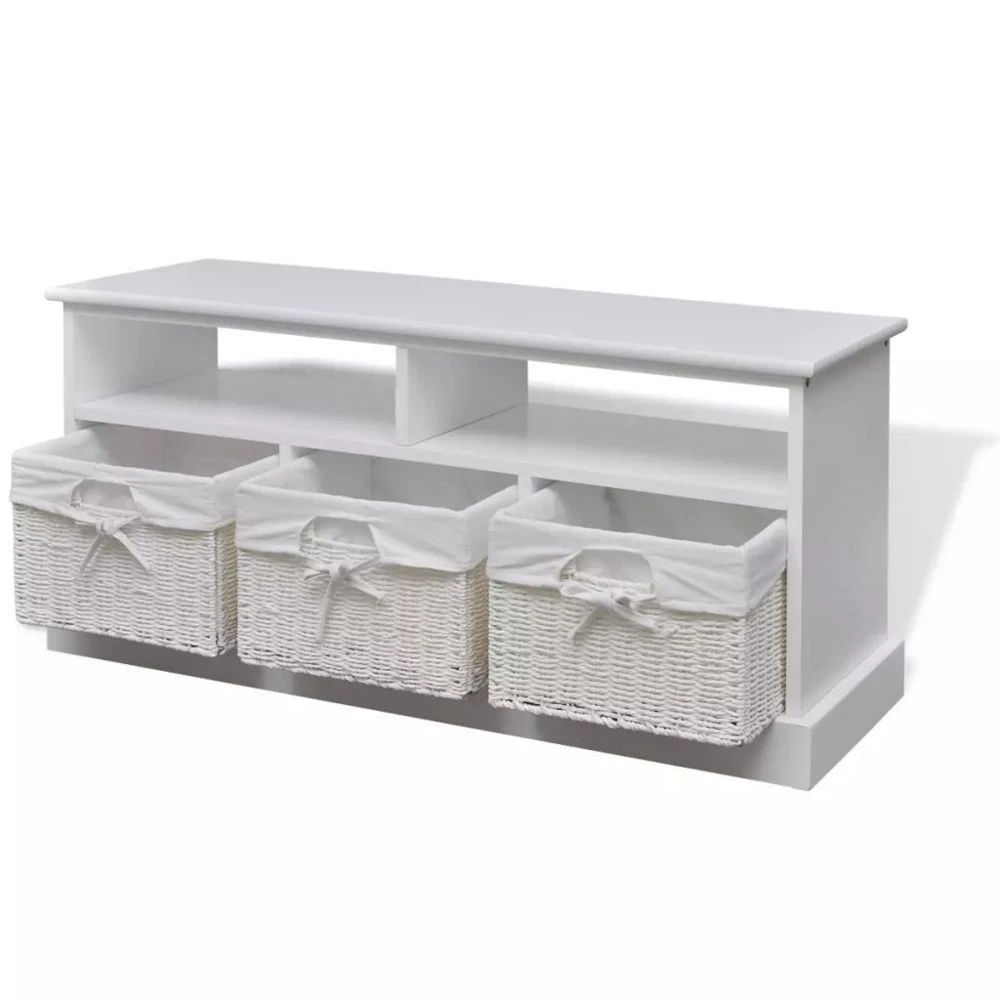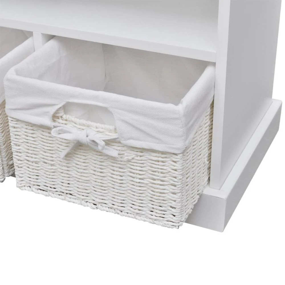 Ce banc de stockage, fait de matériaux de haute qualité, vous donnera un ample espace de stockage tout en ajoutant une touche romantique au décor de votre pièce. Il inclut 3 paniers tissés, très robustes. Chaque panier a une doublure en tissu lavable. Cette armoire durable sera très bien sur votre porche, dans votre garde-robe, chambre ou tout autre pièce dans la maison. Matériaux: MDF Couleur: Blanc Taille totale: 95 x 35 x 44 cm (L x l x H) Taille du panier: 31 x 27 x 19 cm (L x l x H) Epaisseur MDF: 1,5 cm La livraison inclut également 3 paniers tissés Matériel: Coton: 50%, Polyester: 50%
