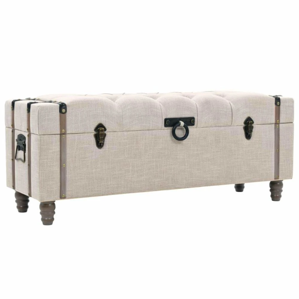 Ajoutez une touche vintage à votre décoration intérieure avec notre ensemble de 3 bancs de rangement. Les boîtes de rangement sont en bois de sapin massif. Ells disposent de sièges rembourrés qui sont tapissés avec un tissu moderne et ont des pieds robustes en acier. Il y a suffisamment d’espace pour garder une foule d’objets différents hors de la vue mais à portée de main. Si nécessaire, les 2 petits poufs peuvent être rangés dans la plus grande boîte. Grâce à leurs poignées durables, les bancs sous forme de coffre peuvent également être facilement déplacés et placés dans n’importe quelle pièce. La livraison comprend 3 bancs de rangement. L’assemblage de cet article est facile. Couleur : blanc cassé Matériau : Bois de sapin + panneau d’aggloméré + tissu + acier Dimensions du plus grand banc : 112 x 37 x 45 cm (L x l x H) Dimensions du plus petit banc : 43,5 x 31 x 37 cm (L x l x H) Avec assise rembourrée et tapissée Facile à assembler La livraison comprend 3 bancs de rangement Matériel: Polyester: 100%
