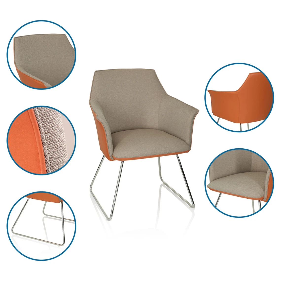 AREZZO V – une finition de haute qualité et un design exceptionnel unis dans une chaise visiteur. Le secret de cette chaise distincte est la combinaison courageuse de deux couleurs complémentaires ainsi que de matériaux différents. L’assise aux accoudoirs intégrés est rembourrée et revêtue de tissu. La partie extérieure est en plastique innovant et similicuir résistant. L’ensemble répose sur un piètement traîneau robuste en acier élégant chromé