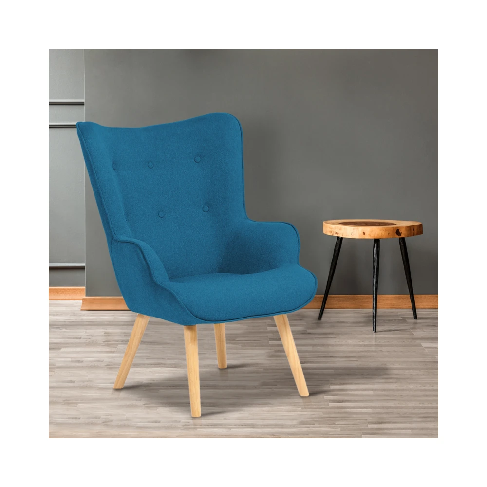 Vous craquez pour le style suédois en matière d’ameublement ? Invitez l’ambiance chaleureuse du design scandinave dans votre salon avec le fauteuil en tissu nordique bleu canard. Profitez d’un fauteuil confortable et élégant à petit prix avec les offres imbattables ID Market. Devant la télé ou à côté de la bibliothèque, vous allez adorer ce meuble tendance et cosy.Descriptif du fauteuil nordiqueAvec son haut dossier capitonné et son assise moelleuse, vous pourrez profiter d’un fauteuil scandinave pas cher et confortable. Avec son design simple mais élégant, il s’intègre parfaitement à toutes les pièces, du salon à la chambre. Découvrez le charme des pieds en bois blond avec le tissu bleu canard ultra tendance.Stable et robuste, le fauteuil scandinave sera le compagnon parfait pour une pause lecture ou devant la télévision. Ses deux accoudoirs et son assise moelleuse forment un véritable cocon de confort, que vous ne voudrez plus quitter. Pour rehausser son côté déco cocoon, n’hésitez pas à l’agrémenter d’un plaid aux couleurs pastel ou d’un coussin gris pour jouer sur les contrastes. L’association des matériaux et des couleurs, du bois et du tissu, font de ce fauteuil nordique l’atout déco de votre intérieur.Découvrez un revêtement tissu agréable au toucher et esthétique. Le fauteuil bleu canard est composé d’une toile 100 % polyester capitonné, avec 6 boutons décoratifs pour des finitions de qualité.Les formes arrondies du fauteuil scandinave bleu canard contribuent à créer une atmosphère cosy et propice à la détente. Prenez votre livre préféré, une tasse de thé et laissez-vous aller à la détente dans votre nouveau fauteuil. Et pourquoi ne pas profiter des petits prix ID Market pour installer un fauteuil design scandinave dans la chambre d’ami ou dans l’entrée ? Adoptez la tendance chic et cosy tout droit venue de Scandinavie !Dimensions du fauteuil scandinaveMatériaux : structure en bois4 Pieds bois inclinés avec patins de protectionGarnissage : mousse polyuréthane (recyclée et non recyclée)2 accoudoirsDimensions totales : Longueur 71 cm x largeur 75 cm x hauteur 94.5 cmDimensions de l’assise : Longueur 45 cm x largeur 50 cm (Hauteur : 45 cm)Hauteur du dossier à partir du coussin : 60 cmAutre coloris disponible sur notre boutique en ligne :- Fauteuil scandinave IVAR en tissu gris anthracite- Fauteuil scandinave IVAR en tissu jaune