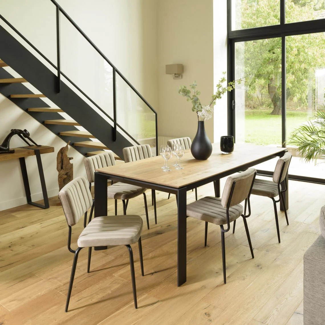 Composées de velours, ces chaises offrent une assise très confortable et douce. Sa teinte neutre se marie à merveille avec ses pieds en métal noir et s’associera à tout type de décoration grâce à sa simplicité.