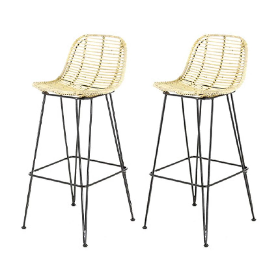 Faites de votre intérieur un endroit convivial en le meublant avec ce lot de 2 chaises de bar en rotin naturel. Ce modèle est destiné à compléter une table de bar ou un comptoir de cuisine, afin de prendre le repas ou siroter un verre. Composé par quatre supports en forme de V et reliés par des repose-pieds horizontaux, son long piètement est fabriqué avec du métal. Le siège est constitué par un tissage fin fait avec du rotin, et dont le résultat offre une texture transparente au niveau des deux surfaces continues. La couleur naturelle de la fibre rappelle la touche rustique de votre décoration.