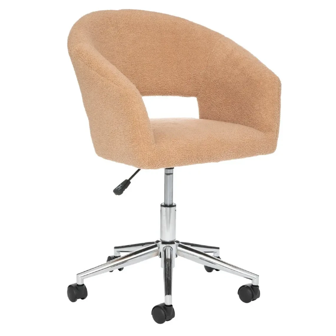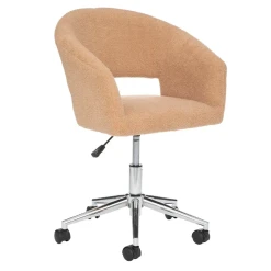 Chaise de bureau en tissu beige à bouclettes avec une assise en polyester rembourrée en mousse polyuréthane et pieds croisés situés au centre en métal.
