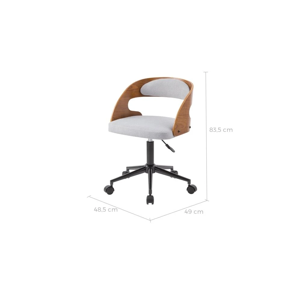 Avec son mélange de contreplaqué en bois de noyer, de tissu et de métal, notre chaise de bureau Louis est un petit bijou. Vous aimerez son allure d’un chic fou sur des dimensions agréables L 48,5 x P 46 x H 71,5/83,5 cm.