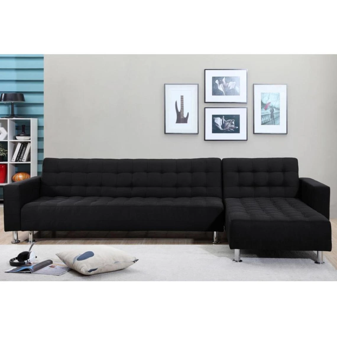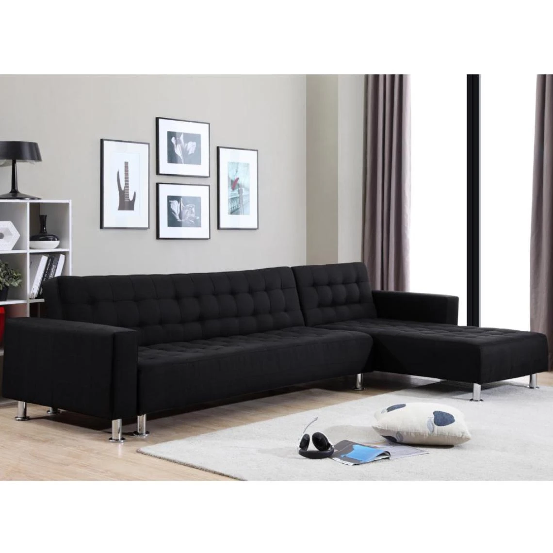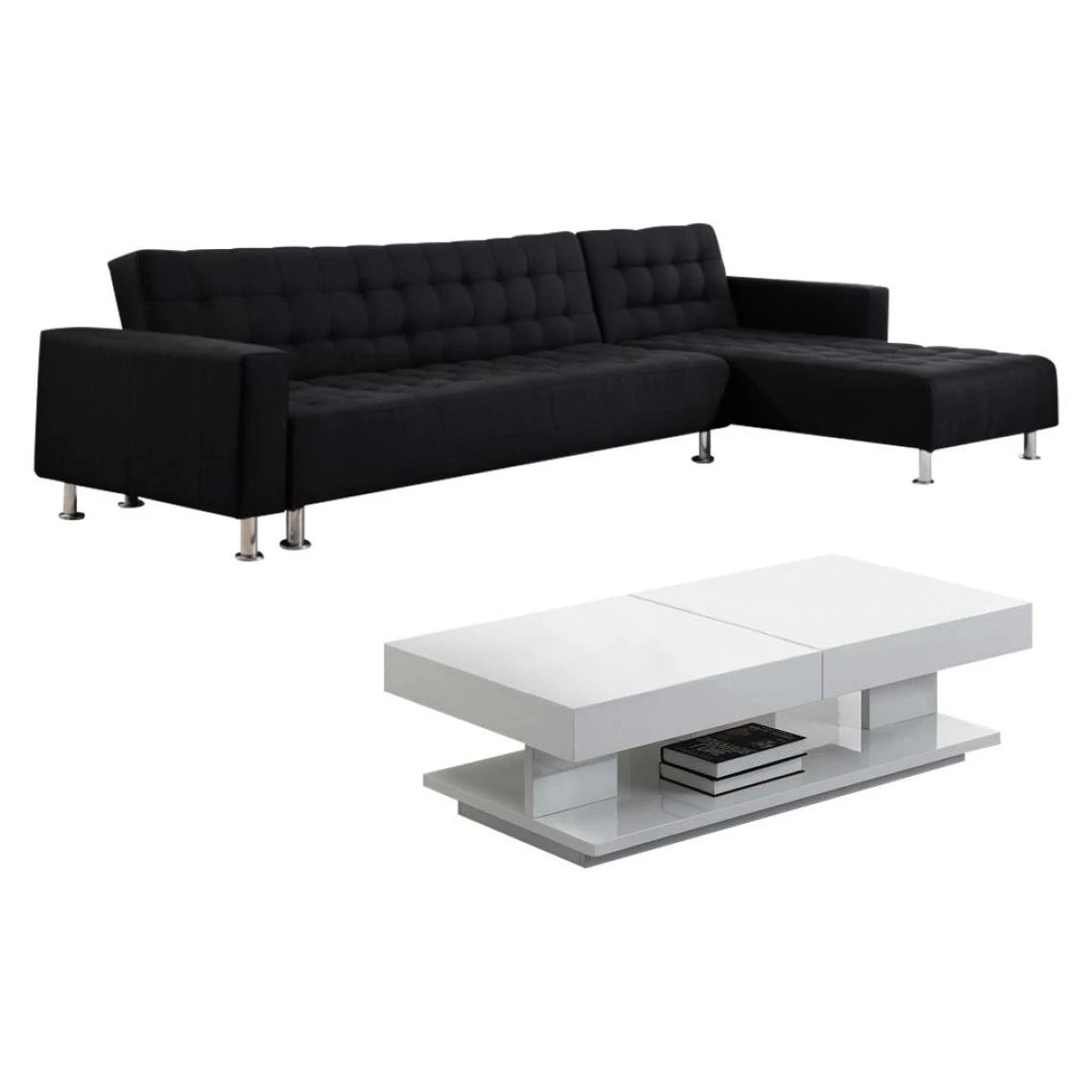 Points forts Vente-Unique Ensemble canapé d’angle convertible et réversible noir WILLIS et table basse blanche ARAMIS