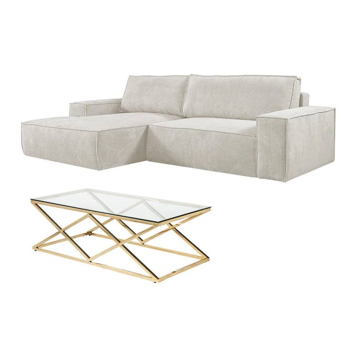 Points forts Vente-Unique Ensemble canapé d’angle gauche convertible beige AMELIA et table basse dorée CHARLOTTE